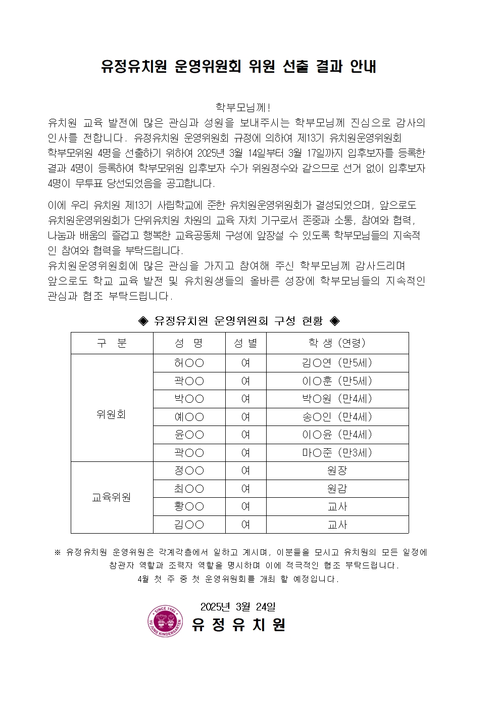 | 제목 | 2025학년도 유치원 운영위원회 선출 결과 안내 | ||
