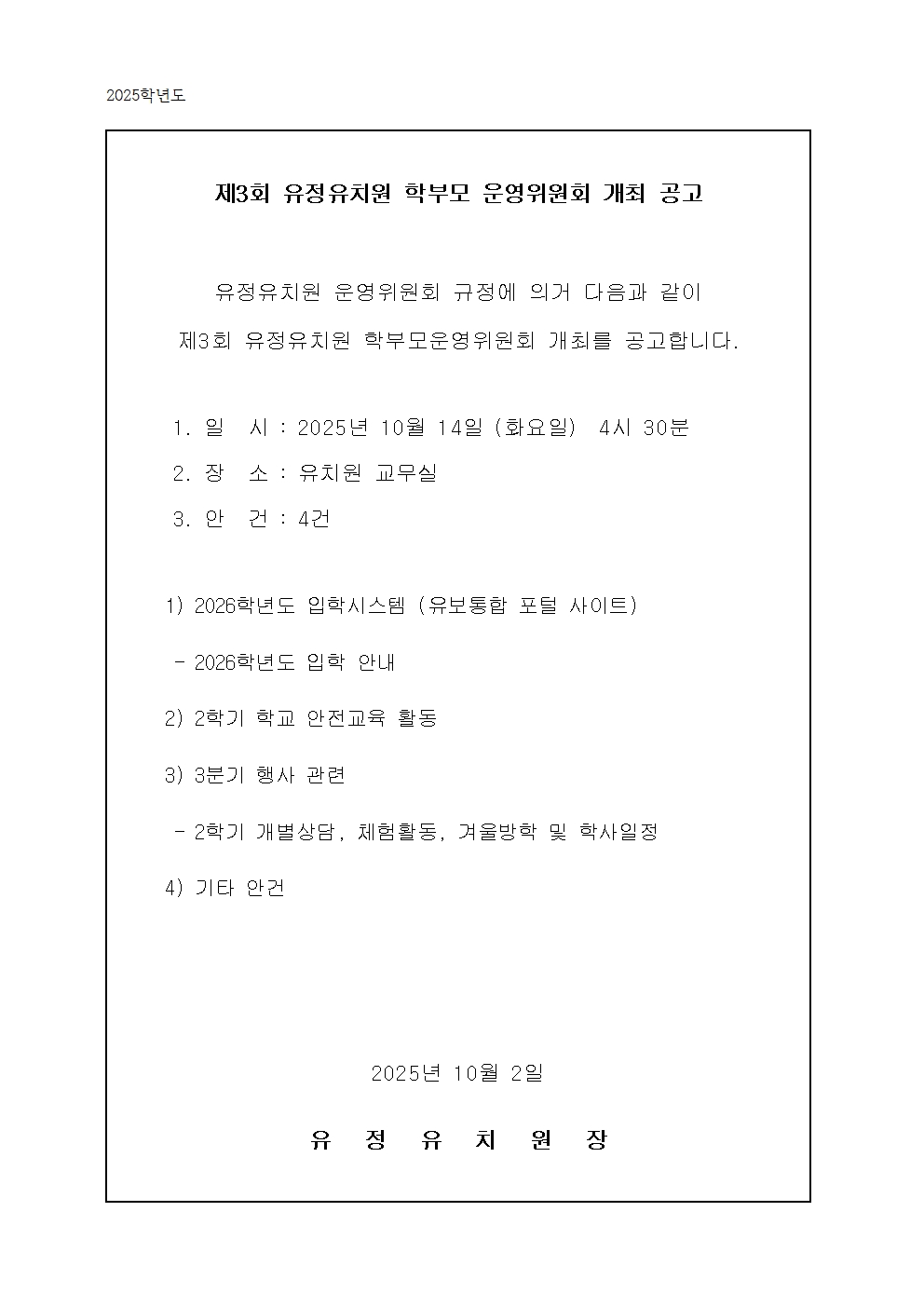 | 제목 | 2025학년도 3차 학부모 운영위원회 개최 공고 | ||